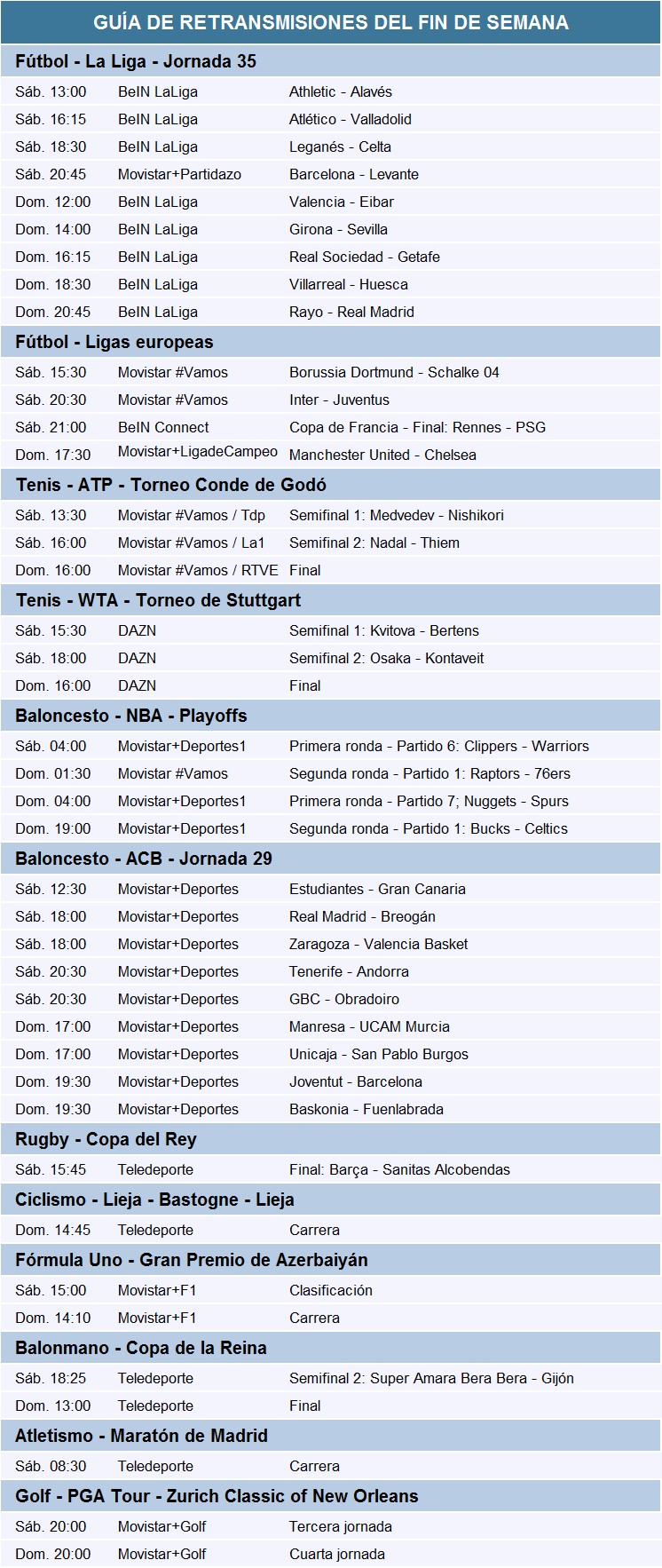 Guía de las retransmisiones deportivas del fin de semana