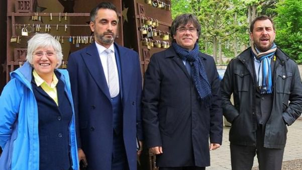 | El expresidente de la Generalidad, Carles Puigdemont, acompañado de los exconsejeros Toni Comín y Clara Ponsatí. (Foto: EFE) |