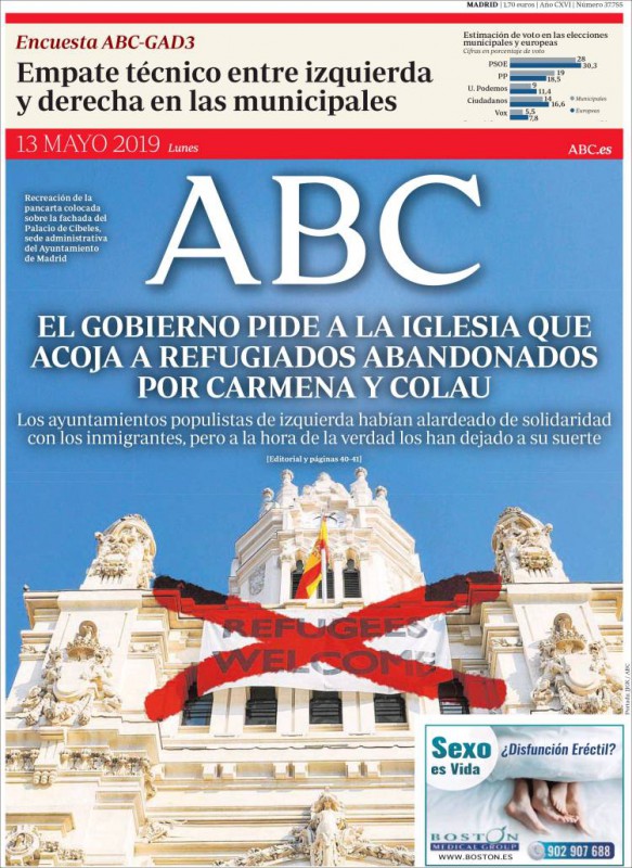 ABC: "El Gobierno pide a la Iglesia que acoja a refugiados abandonados por Carmena y Colau. Los Ayuntamientos populistas de izquierda habían alardeado de solidaridad con los inmigrantes, pero a la hora de la verdad los han dejado a su suerte"; "Encuesta: empate técnico entre izquierda y derecha en las municipales".
