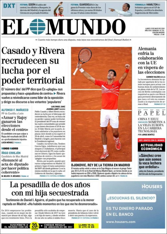 El Mundo: "Casado y Rivera recruden su lucha por el poder territorial"; "Alfonso F. Mañueco (PP de Castilla y León); Aznar y Rajoy ganaron las elecciones desde el centro"; "Íñigo Errejón: Renuncié al acta de diputado por hacer política coherente"; "Djokovic, rey de la tierra en Madrid"; "Alemania enfría la colaboración con la UE en víspera de las elecciones".