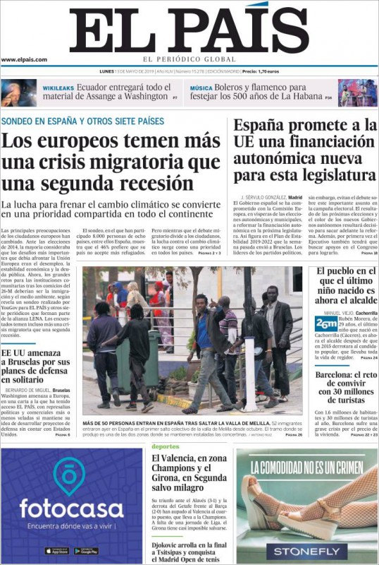 El País: "Sondeo: los europeos temen más una crisis migratoria que una segunda recesión"; "España promete a la UE una financiación autonómica nueva para esta legislatura"; "EEUU amenaza a Bruselas por sus planes de defensa en solitario"; "Barcelona: el reto de convivir con 30 millones de turistas".