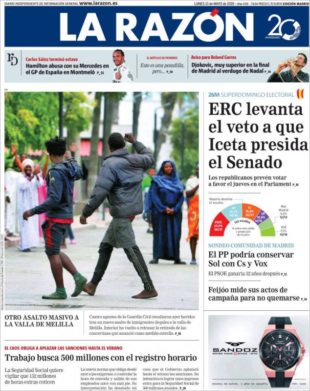 La Razón: "Otro asalto masivo a la valla de Melilla"; "ERC levanta el veto a que Iceta presida el Senado"; "Sondeo Comunidad de Madrid: el PP podría conservar Sol con Cs y Vox"; "Trabajo busca 500 millones con el registro horario"; "Feijóo mide sus actos de campaña para no quemarse".