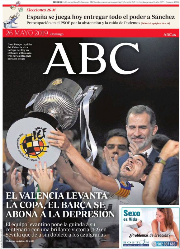 ABC: "España se juega hoy entregar todo el poder a Sánchez"; "El Valencia levanta la Copa, el Barça se abona a la depresión".