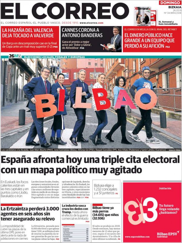 El Correo: "España afronta hoy una triple cita electoral con un mapa político muy agitado"; "La hazaña del Valencia deja tocado a Valverde"; "Cannes corona a Antonio Banderas".