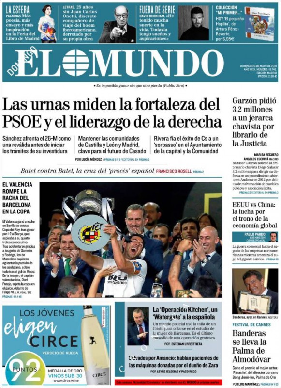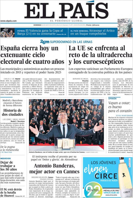 El País: "España cierra hoy un extenuante ciclo electoral de cuatro años"; "La UE se enfrenta al reto de la ultraderecha y los euroescépticos"; "Madrid y Barcelona encaran el futuro de forma diferente"; "El Valencia gana la Copa al Barça (2-1) en su centenario".