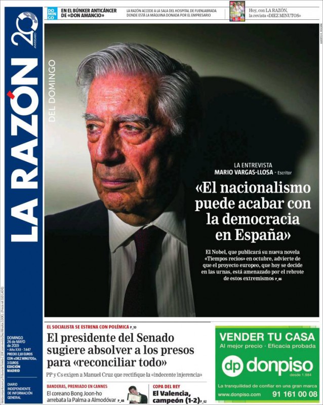 La Razón: "Mario Vargas-Llosa: 'El nacionalismo puede acabar con la democracia en España'"; "El coreano Bong Joon-ho arrebata la Palma a Almodóvar"; "El Valencia, campeón (2-1)".
