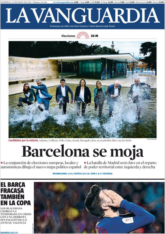 La Vanguardia: "Barcelona se moja"; "La conjunción de elecciones europeas, locales y autonómicas dibuja el nuevo mapa político español"; "La batalla de Madrid será clave en el reparto de poder territorial entre izquierda y derecha".