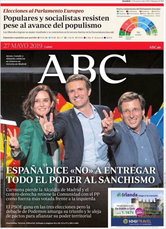 ABC: "España dice 'no' a entregar todo el poder al Sanchismo"; "Carmena pierde la Alcaldía de Madrid y el centro-derecha retiene la Comunidad con el PP como fuerza más votada frente a la izquierda"; "El PSOE gana en las tres elecciones pero la debacle de Podemos amarga su triunfo y le aleja de pactos para afianzar su poder territorial".