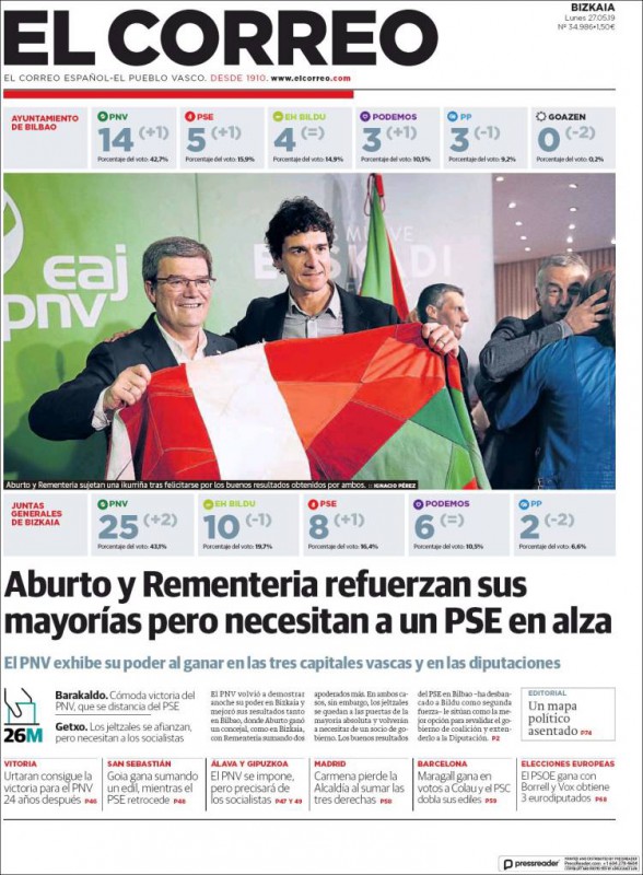 El Correo: "Aburto y Rementeria refuerzan sus mayorías pero necesitan a un PSE en alza"; "El PNV exhibe su poder al ganar en las tres capitales vascas y en las diputaciones"; "Urtaran consigue la victoria para el PNV 24 años después"; "Goia gana sumando un edil, mientras el PSE retrocede".