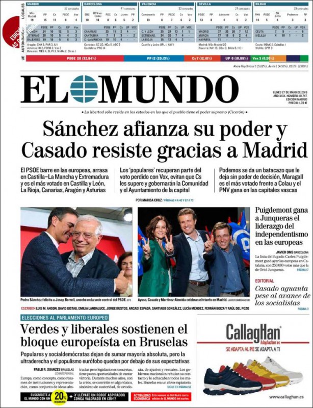El Mundo: "Sánchez afianza su poder y Casado resiste gracias a Madrid"; "El PSOE barre en las urnas, arrasa en castilla-La Mancha y Extremadura y es el más votado en Castilla y León, La Rioja, Canarias, Aragón y Asturias"; "Verdes y liberales sostienen al bloque europeísta en Bruselas".