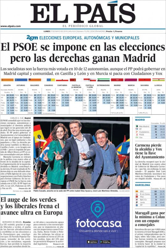 El País: "El PSOE se impone en las elecciones pero las derechas ganan Madrid"; "Los socialistas son la fuerza más votada en 10 de 12 autonomías, aunque el PP podrá gobernar en Madrid y su comunidad, y en Castilla y León y Murcia si pacta con Ciudadanos y Vox"; "El auge de los verdes y los liberales frena el avance ultra en Europa"; "Carmena pierde la alcaldía y Vox tiene la llave del Ayuntamiento".