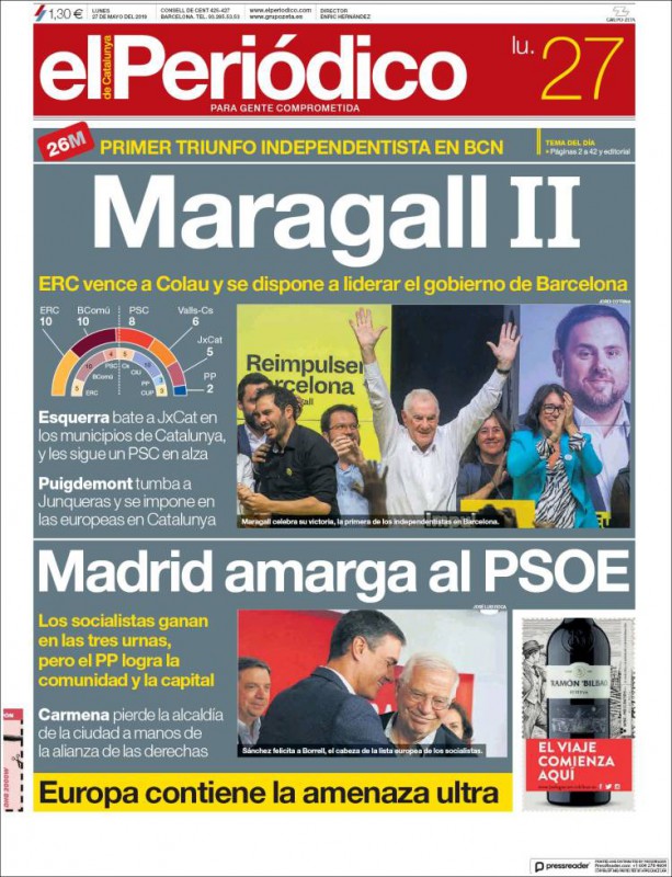 El Periódico: "Maragall II"; "ERC vence a Colau y se dispone a liderar el gobierno de Barcelona"; "Madrid amarga al PSOE"; "Los socialistas ganan en las tres urnas, pero el PP logra la comunidad y la capital"; "Carmena pierde la alcaldía de la ciudad a manos de la alianza de las derechas"; "Europa contiene la amenaza ultra".