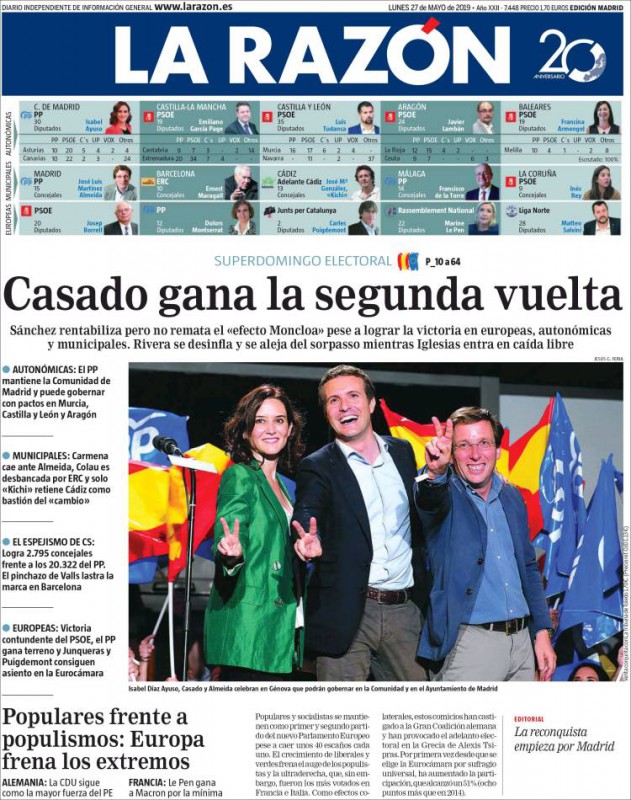 La Razón: "Casado gana la segunda vuelta"; "Populares frente a populismos: Europa frena los extremos".