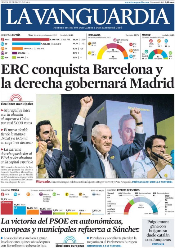 La Vanguardia: "ERC conquista Barcelona y la derecha gobernará Madrid"; "Maragall se hace con la alcaldía al superar a Colau por casi 5.000 voto"; "La victoria del PSOE en autonómicas, europeas y municipales refuerza a Sánchez"; "Puigdemont gana con holgura su duelo catalán con Junqueras".