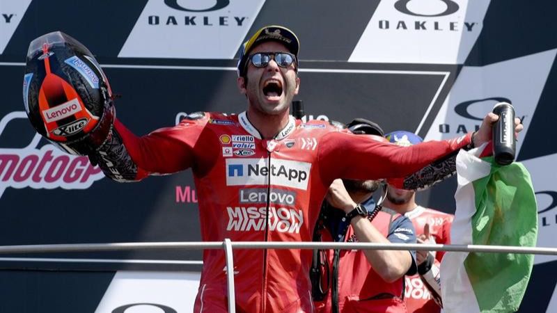 El motociclismo trasalpino pudo disfrutar este domingo de una jornada de celebración. Danilo Petrucci (Ducati Desmosedici GP19) venció en el Gran Premio de Italia de MotoGP, estrenando, de este modo, su palmarés de victorias en la presente temporada. El presunto segundón de Andrea Dovizioso se dio el gusto de arrebatar la gloria a Marc Márquez por tan solo 43 milésimas de segundo, en un desenlace de carrera realmente espectacular.