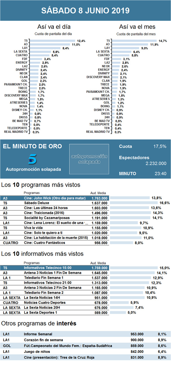 Así, el programa nocturno de Telecinco pasó a ocupar el segundo puesto nocturno, si bien, no varió apenas su audiencia de la semana pasada. Por detrás, La 1 y La Sexta volvieron a luchar, en esta ocasión para ser tercera opción nocturna. La cadena pública vio mejorar levemente los registros de su programa Juego de niños y, en menor medida, La Sexta Noche también aumentó su audiencia.