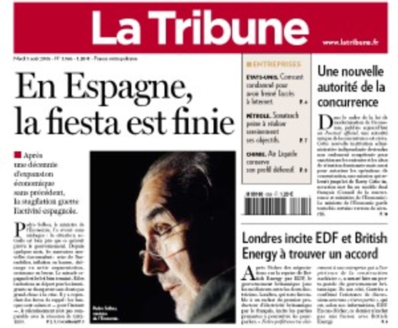 'La Tribune' publica como información más importante de su edición de hoy un detallado análisis de la situación económica en España. En la portada del diario se puede ver un retrato de perfil del Ministro de Economía español, Pedro Solbes, situado bajo un gran titular: "En España, la fiesta se ha terminado".