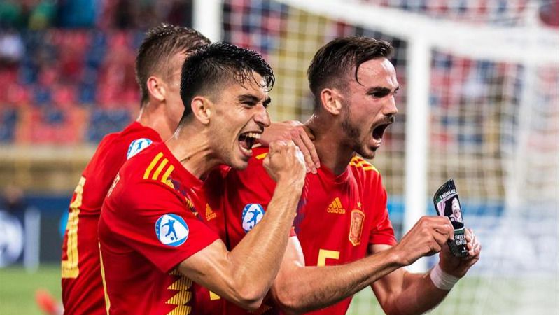 5 - España: Sivera; Aguirregabiria, Nuñez, Meré, Aarón; Fabián (Merino, m.76), Roca, Ceballos (M. Vallejo, m.88), Fornals, Olmo; Oyarzabal (Mayoral, m.60).