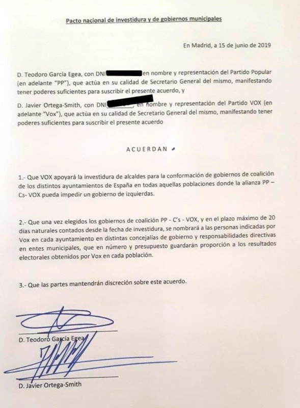 En el documento, de corte muy genérico, PP y Vox se comprometen a formar "gobiernos de coalición en los distintos ayuntamientos de España en todas aquellas poblaciones donde la alianza PP-Cs-Vox pueda impedir un gobierno de izquierdas".