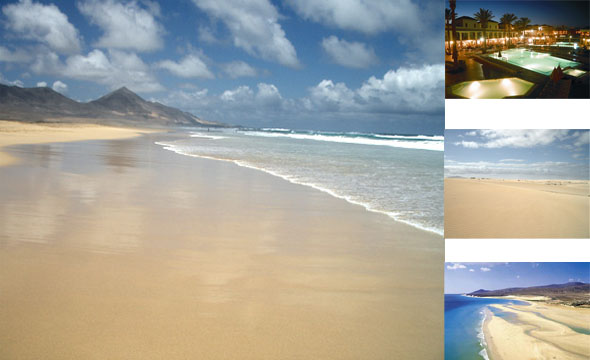 En las costas son frecuentes playas de varios kilómetros, de arena blanca y negra, lo que ha posibilitado la afluencia masiva de turistas a la isla. Al sur se encuentran las playas de la Península de Jandía, las más extensas de Canarias, que van desde Costa Calma, pasando por Esquinzo-Butihondo, Morro Jable y el Puertito de la Cruz, hasta la Punta de Jandía, por la zona de Sotavento y desde la Punta de Jandía, pasando por Cofete hasta La Pared, por la zona de Barlovento. En el norte destacan las playas de Corralejo, con sus extensas dunas de arena dorada. Dadas las condiciones de viento y del agua de las costas se ha desarrollado una infraestructura asociada a la práctica del windsurfing y el buceo.