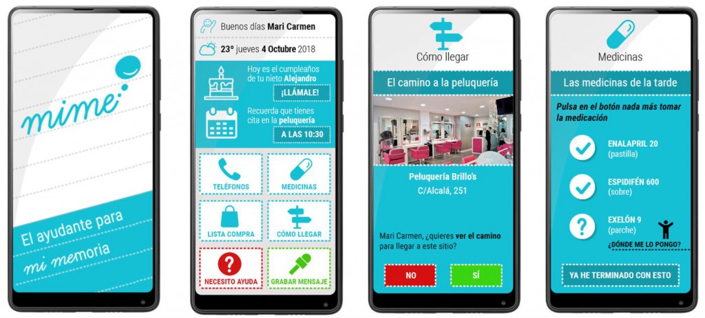 ‘MiMe’ es una aplicación para dispositivos móviles pionera en el mercado que consta de 2 piezas: el propio MiMe (Mi Memoria) para los pacientes con Alzheimer y SuMe (Su Memoria) para facilitar la tarea de sus cuidadores. Está ya preinstalada en un teléfono para facilitar su uso “en modo Kiosko” por parte de los enfermos de Alzheimer, sustituyendo el sistema operativo del dispositivo y evitando la confusión que otros tipos de mensajes de aplicaciones habituales en los smartphones pudieran generar en los usuarios, asegurando un servicio óptimo y sin interferencias.