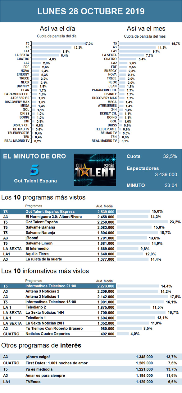 AUDIENCIAS: LUNES 28 DE OCTUBRE DE 2019