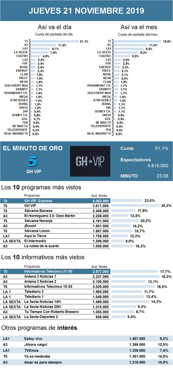 GH VIP mejoró anoche su audiencia y se distanció de su principal rival, Estoy vivo. El ascenso fue tal que el número de espectadores casi iguala a los obtenidos por los programas nocturnos de RTVE y Atresmedia juntos.