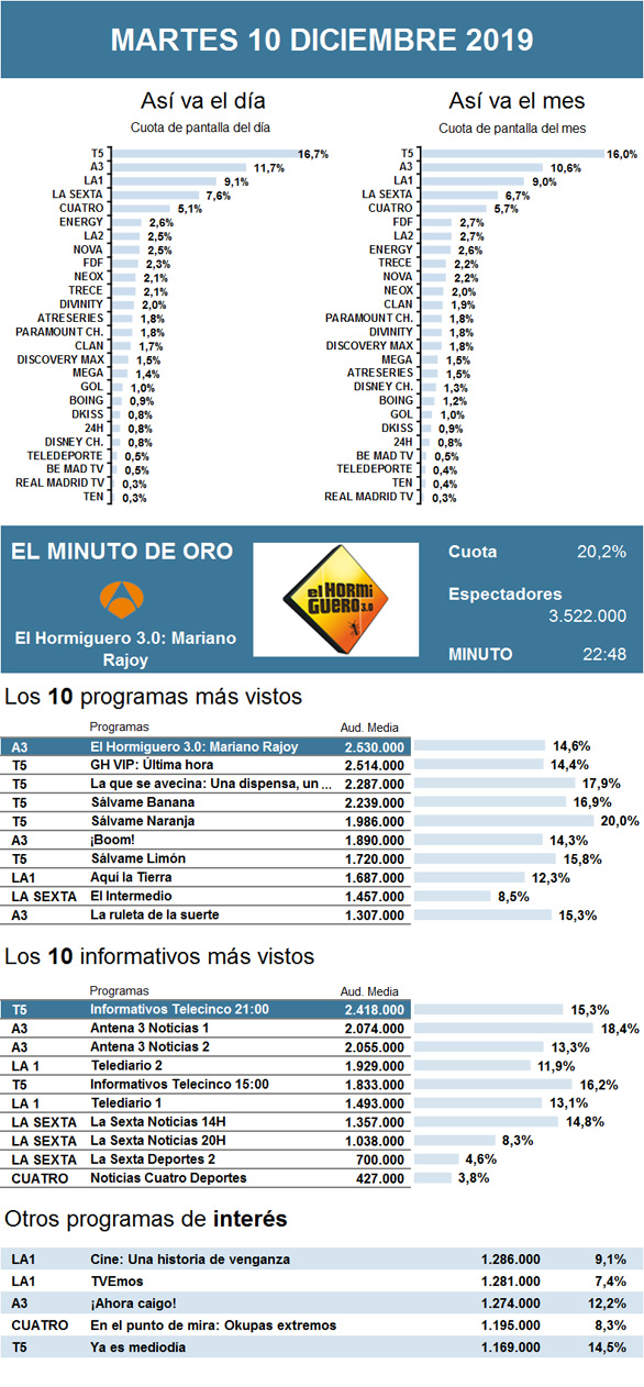 AUDIENCIAS: MARTES 10 DE DICIEMBRE DE 2019