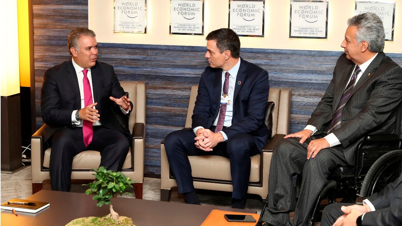 El presidente del Gobierno de España Pedro Sánchez, el presidente de Colombia Iván Duque (i) y el presidente de la república de Ecuador Lenín Moreno (d), durante la reunión en Davos. (Foto: Efe)
