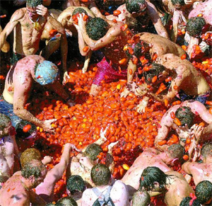 La escaramuza no se hizo esperar y las hortalizas que un buen hombre vendía en la plaza mayor sirvieron de armas arrojadizas. Desde entonces, el último miércoles de agosto, unas 40.000 personas participan en la batalla más "sangrienta" de la historia, en la que se utilizan 100.000 kilos de tomate.