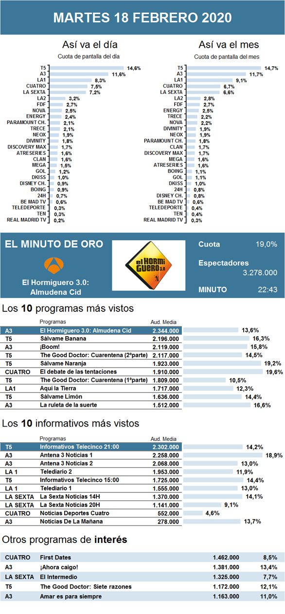Este martes, El Hormiguero 3.0 se impuso como lo más visto del día y como minuto de oro gracias a la visita de Almudena Cid. Cabe mencionar que el programa reunió medio millón más de interesados que su principal rival del 'access', el primero de los dos nuevos episodios de The Good Doctor.