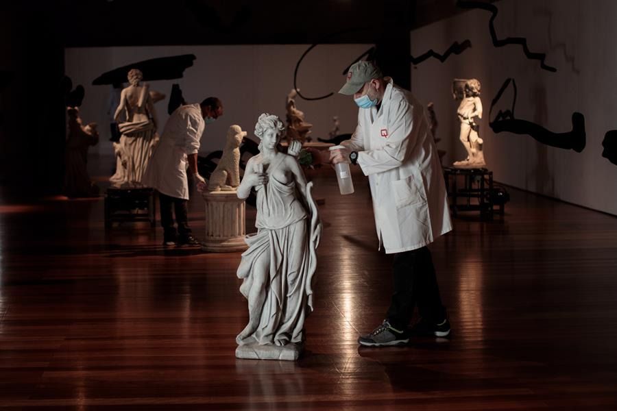 - ESPAÑA: Los grandes museos españoles, como el Thyssen, el Prado o el Reina Sofía, no tienen por ahora fecha fijada de apertura, aunque todo apunta a que será en las últimas semanas de junio y si la epidemia lo permite. Cuando reabran, el plan del Gobierno impone una reducción del aforo a un tercio y la obligatoriedad de mantener una distancia de seguridad de dos metros entre visitantes, se eliminan folletos, consignas y audioguías.