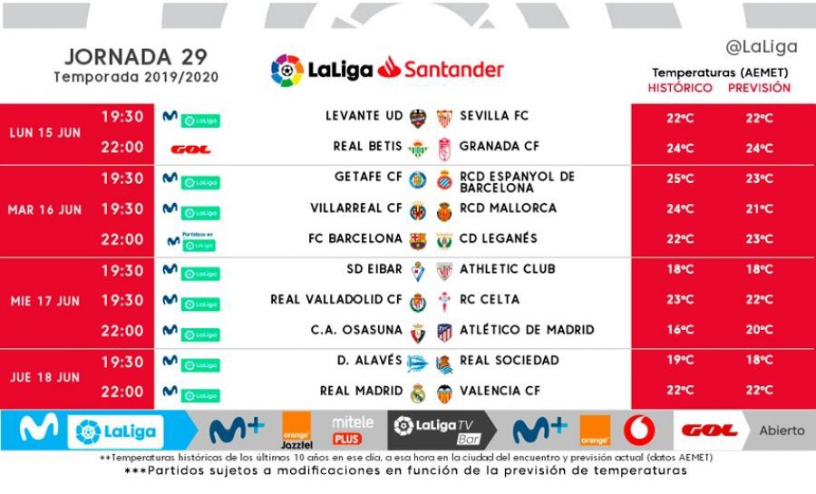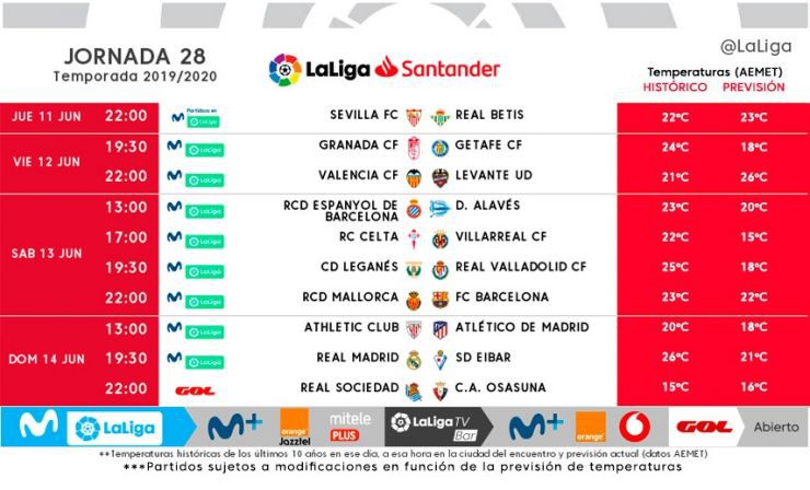 El regreso de LaLiga ya tenía fecha, 11 de junio, y desde el domingo, también horarios. Las jornada 28 arrancará el jueves 11 a las 22:00 con el Sevilla-Betis y se alargará hasta el domingo con un Real Sociedad-Osasuna también a las 22:00.