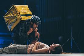 Mucho más creativa es la tercera obra Marta y la conmoción, en la que la protagonista corre sin sentido mientras se escucha un diálogo de Forrest Gum cuando cruza por segunda vez el Mississippi. ¿Por qué corres? ¿Por la paz mundial? ¿Por la gente sin hogar? ¿Lo hace por los derechos de la mujer? ¿Por el medio ambiente? ¿Por los animales? ¿Contra las armas nucleares? Pero el “tonto” de Forrest no lo hace por ninguna consigna: “¡Solo tenía ganas de correr!”. Marta se suma a esa carrera alocada en un pronto sin mucho sentido, en plena noche. La conmoción por la pandemia adopta en su caso la forma de un choque alegórico con la bicicleta de un repartidor de Glovo, que además de dejarla conmocionada en el suelo deteniendo su carrera gratuita le apremia asimismo a hacer una meditación, por supuesto alucinada, dadas las circunstancias, pero no por eso superflua o disparatada sino inteligente en su extravío. La conmoción física tras el encontronazo encarna, pues, la conmoción colectiva de una sociedad que se ve obligada a dejar de hacer las cosas por rutina. Jugoso diálogo entre la atropellada y el repartidor, con un habla coloquial lleno de viveza, ingenioso, sorprendente, que abre paso a cavilaciones pasmosas que llevan a ver todo, en esa noche eterna, desde una nueva perspectiva insólita. “Y si no hay un mañana. No quiero que el Apocalipsis me pille haciendo un bizcocho”. Lo que antes queríamos, empezamos a no desearlo: “Nos imponemos lo que queremos, y lo que queremos es otra cosa”. La conmoción nos impele a tomar conciencia de nuestra anterior muerte en vida: “Todos estamos más muertos que los muertos, y nos ponemos a contabilizar muertos para creernos más vivos que ellos”. Sin perder la naturalidad del diálogo, es aquí donde el montaje de La conmoción comienza de verdad a reflexionar. O mucho mejor, a hacernos reflexionar más allá de los estereotipos Excelente teatralidad plenamente lograda.
