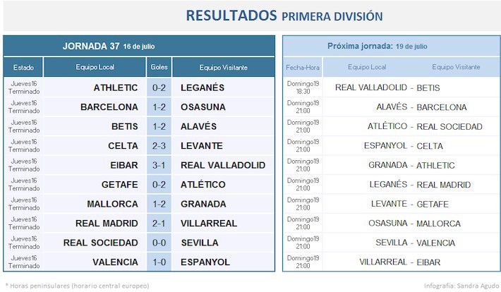 Pero para la última, que se disputa este domingo, aún hay cosas en juego. Dos plazas para la Liga a Europa, que se han de repartir Villarreal, Real Sociedad, Getafe, Valencia y Granada y la última plaza de descenso a Segunda, que queda ya a decidir entre Celta (36 puntos) y Leganés (35).
