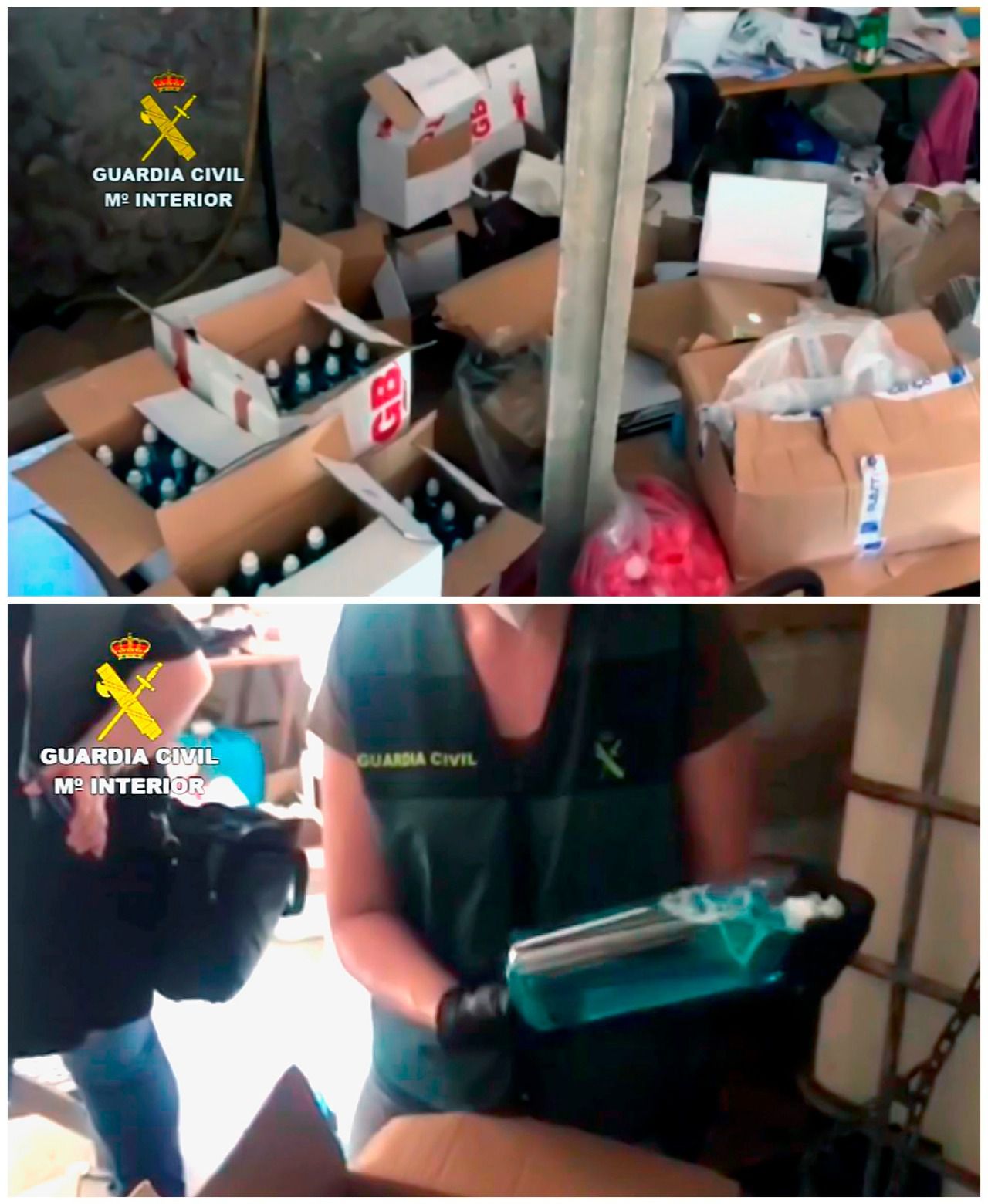 Combo de imágenes que muestra el laboratorio clandestino en el que fabricaban falso gel hidroalcohólico, mezclado con aguardiente y que ha sido desmantelado por la Guardia Civil en una operación en la que han sido detenidas dos personas en la localidad coruñesa de Boiro.