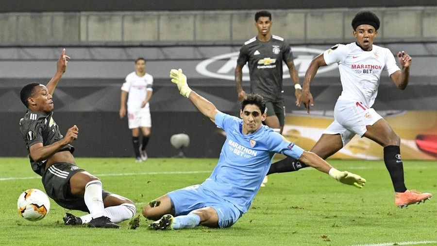 Pogba, Bruno, Greenwood y Rashford disfrutaban colándose por los pasillos centrales, en la mediapunta rival. Al borde de la lona, los cuartos clasificados de LaLiga navegaban sin, siquiera, estirarse a la contra. Abrumaba la superioridad energética del United cuando restaban 30 minutos. Y en el 64, al fin, Banega y Jordán calmarían el compás con su primera posesión larga del segundo tiempo. Empezaba a aflojar el vendaval y en el 70 se completó la metamorfosis del paisaje. Sólo un lanzamiento lejano e inocuo de Pogba inquietaría a Bono antes del advenimiento del desenlace. Con Navas apilando centros al área de De Gea.