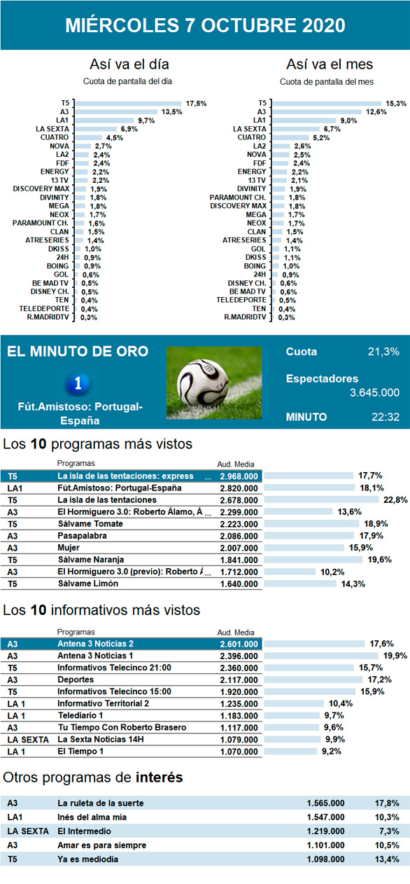 AUDIENCIAS: MIÉRCOLES 7 DE OCTUBRE DE 2020