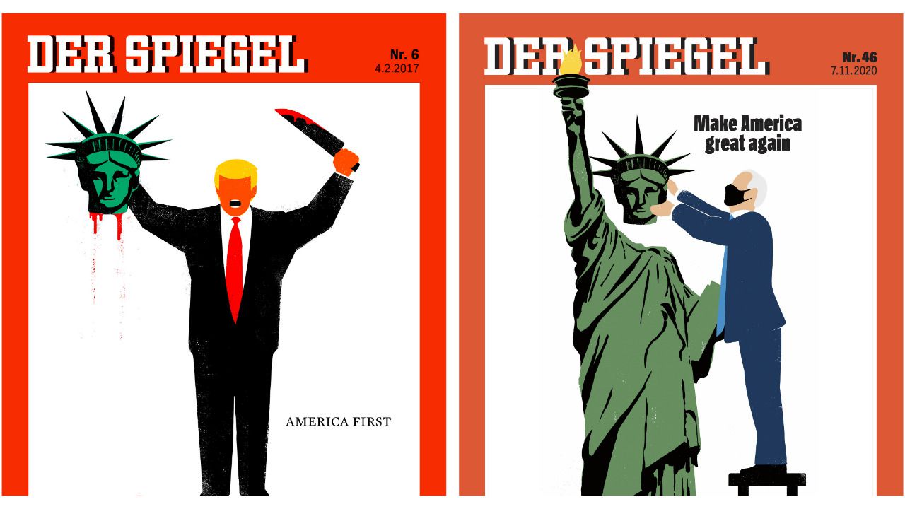 El semanario alemán Der Spiegel ha lanzado una de las portadas más impactantes sobre la victoria de Joe Biden en la carrera por la presidencia de los EEUU. Se trata de una primera página autorreferencial, en la que se muestra una ilustración del cubano Edel Rodríguez.