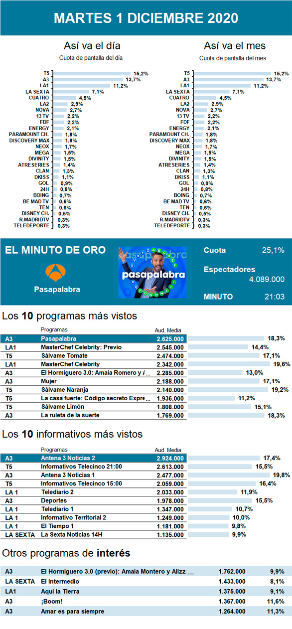 Aunque MasterChef Celebrity volvió a liderar el 'prime time', en esta ocasión su semifinal sufrió un leve descenso de audiencia con respecto a la semana pasada. Esto benefició a su principal contrincante, la serie turca Mujer, que consiguió su segundo mejor martes en Antena 3.