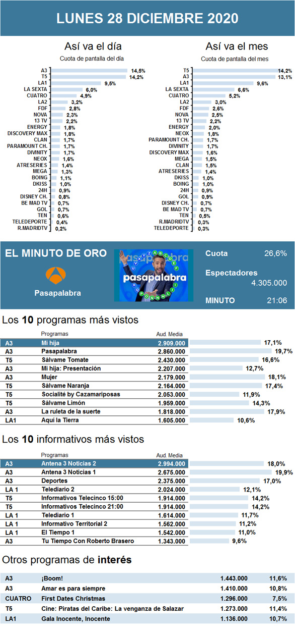 Este lunes, Antena 3 se mantuvo como líder de la noche y, pese a no contar en esta ocasión con El Hormiguero 3.0, acertó al optar por el estreno de Mi hija. La nueva serie turca no sólo consiguió mantener los datos que el programa obtuvo la semana pasada, sino que se impuso como el mejor estreno en abierto de una ficción desde mediados de 2019.