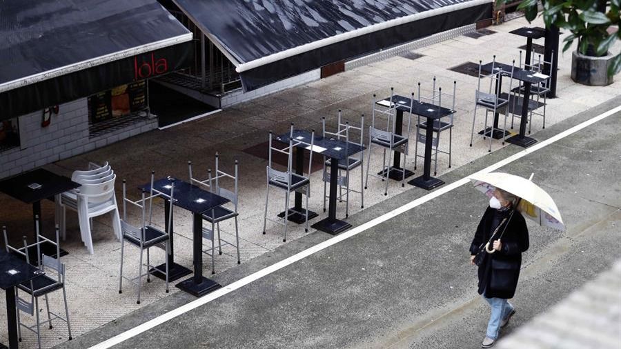 | Un viandante camina cerca de una terraza en Oviedo, donde los bares y restaurantes han permanecido 40 días cerrados. |