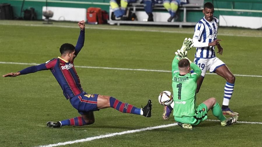 En el tiempo extra se mostraría más entera la Real Sociedad. Sus sustituciones dieron mejor resultado y Zaldua, Oyarzabal y Januzaj lanzaron disparos muy peligrosos. También llamaron a la puerta Griezmann y Dembelé. Pero no se movería el electrónico y el billete a la final del domingo se repartiría en la tanda de penaltis. Y, ahí, emergió la figura del portero alemán. Detuvo los dos primeros chuts rivales, a Bautista y el otrora infalible Oyarzabal. De Jong topó en la madera su chut y Dembèlè fue el primero en anotar. William José remataría también a la madera y Pjanic amplió la ventaja de su sistema. Mikel Merino marcó y Griezmann casi sacó del estadio su zurdazo, recortando la brecha. Finalmente, Januzaj cumplió y forzó al Barça a marcar para clasificarse. La responsabilidad, guiño del destino, recayó en Riqui Puig. Y el canterano, denostado por el técnico neerlandés, dio carpetazo con una ejecución llena de clase que catapultó a los barceloneses y un encuentro del altura. De esos de sacan lustre al balompié nacional.