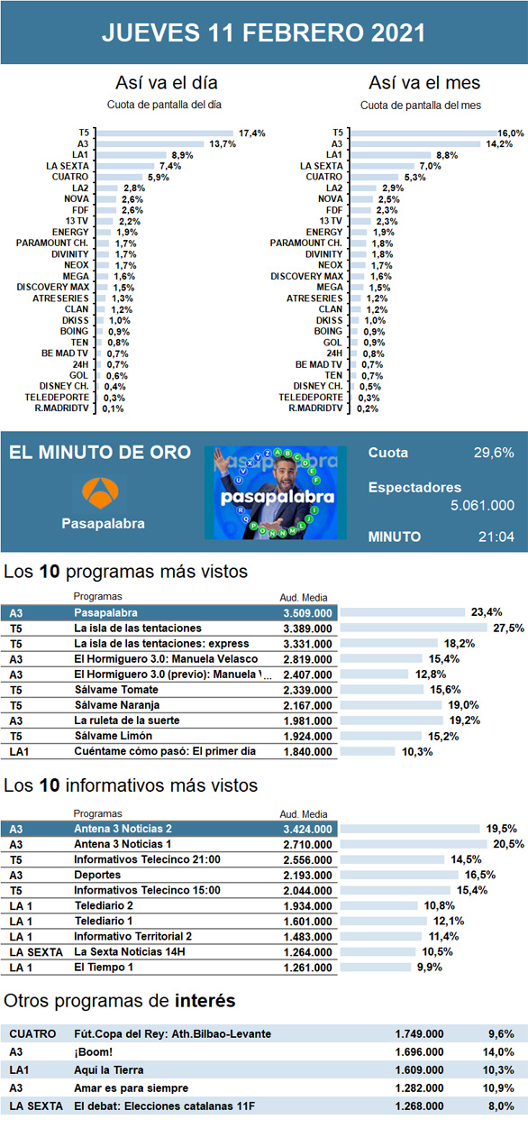 Pese a que el espacio especial El debat: Elecciones catalanas 11F emitido por La Sexta consiguió reunir unos buenos datos de audiencia, la gran vencedora de la noche volvió a ser La isla de las tentaciones, que además batió su récord de esta edición en Telecinco.