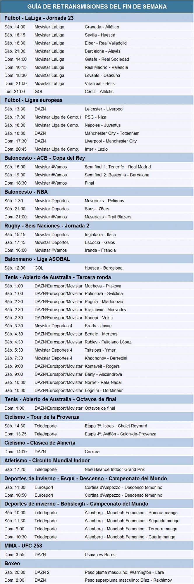 Además, vuelve LaLiga y prosiguen los deportes de invierno.