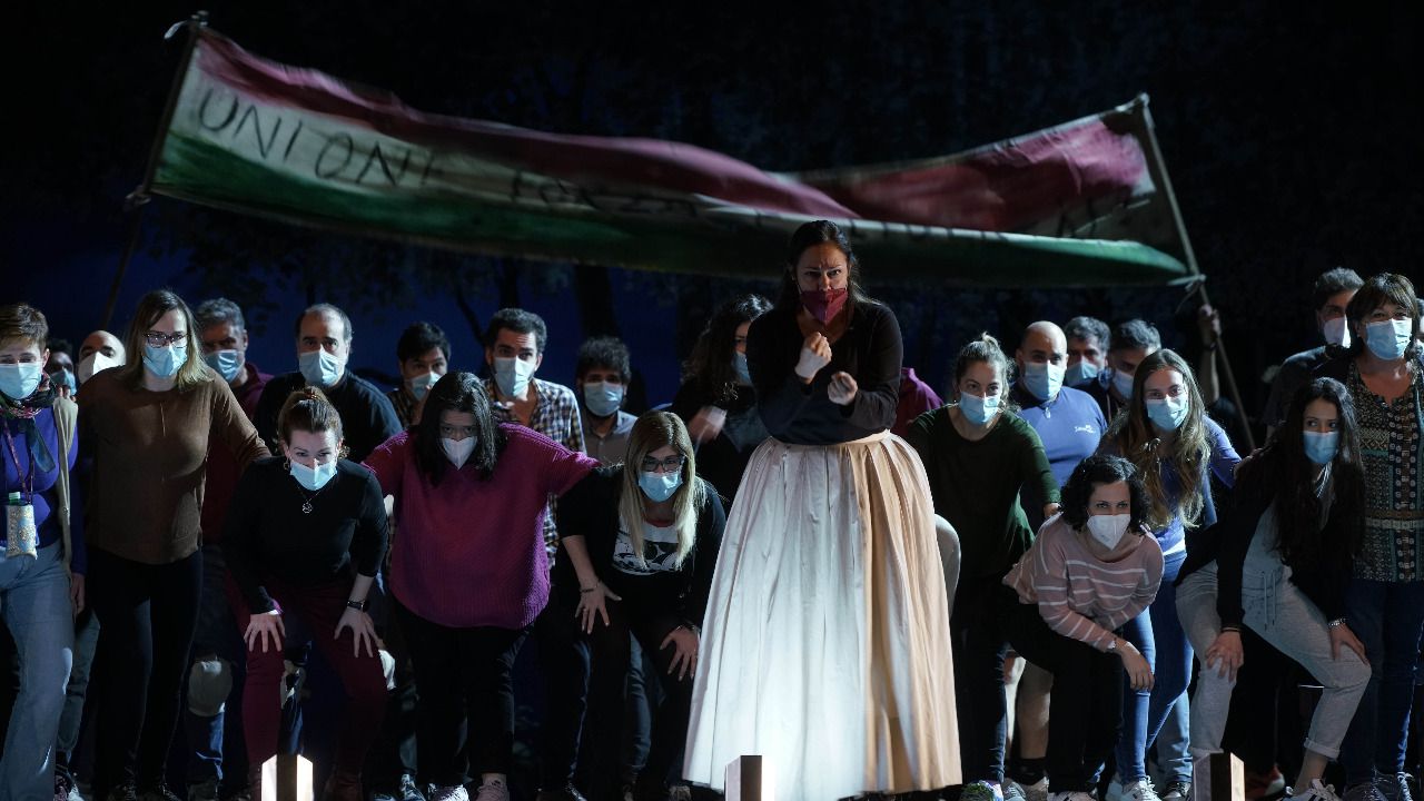 La propuesta plantea un paralelismo entre el argumento de la ópera y la realidad histórica del momento de su estreno en Milán en 1831, ofreciendo al espectador la dualidad prima donna/Norma, austriacos/romanos, coro/patriotas italianos…en una narración de la que es doblemente observador.