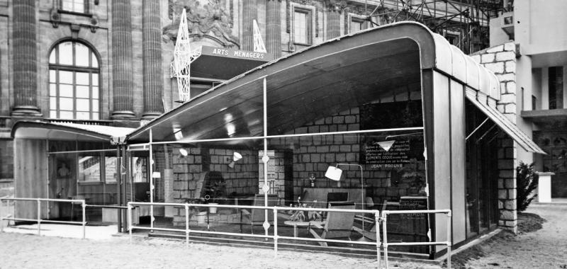 Prouvé participó en la Exposición Internacional de Artes Decorativas e Industriales Modernas de París de 1925. Allí descubrió la obra de los arquitectos modernos, en particular el pabellón L’EspritNouveau, de Le Corbusier y Pierre Jeanneret, y el pabellón del Turismo de Robert Mallet-Stevens. Con este último trabajaría un par de años después en la verja de la casa Reifenberg, en París. Con una quincena de empleados, el taller de Prouvé combinaba la fabricación tradicional y las innovaciones técnicas. A principios de la década de 1930, Prouvé comenzó a utilizar la chapa de acero inoxidable; sin embargo, aún firmaría una última obra maestra de acero y hierro forjado: la verja de entrada del MuséePermanent des Colonies (París, 1931), de los arquitectos LéonBazin, LéonJaussely y Albert Laprade.