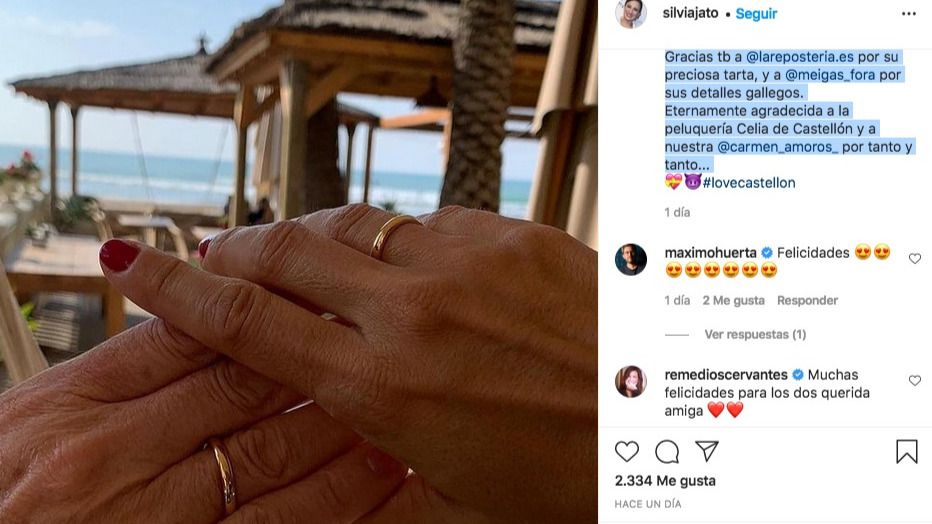 "Mi vestido era precioso, hecho por María Coca", ha detallado Jato, "gracias también a Lareposteria.es por su preciosa tarta, y a Meigas Fora por sus detalles gallegos. Eternamente agradecida a la peluquería Celia de Castellón y a nuestra Carmen Amorós por tanto y tanto.."