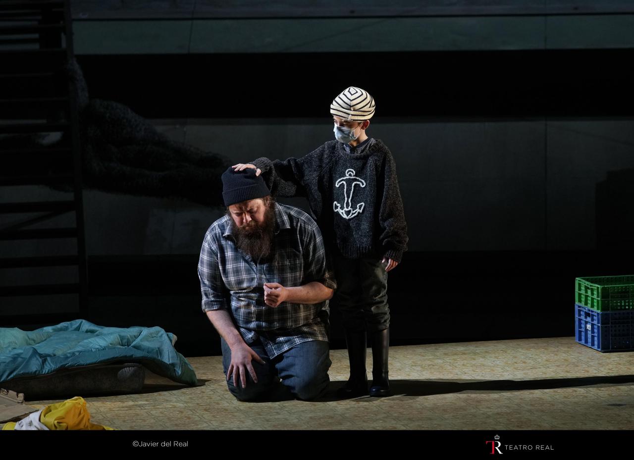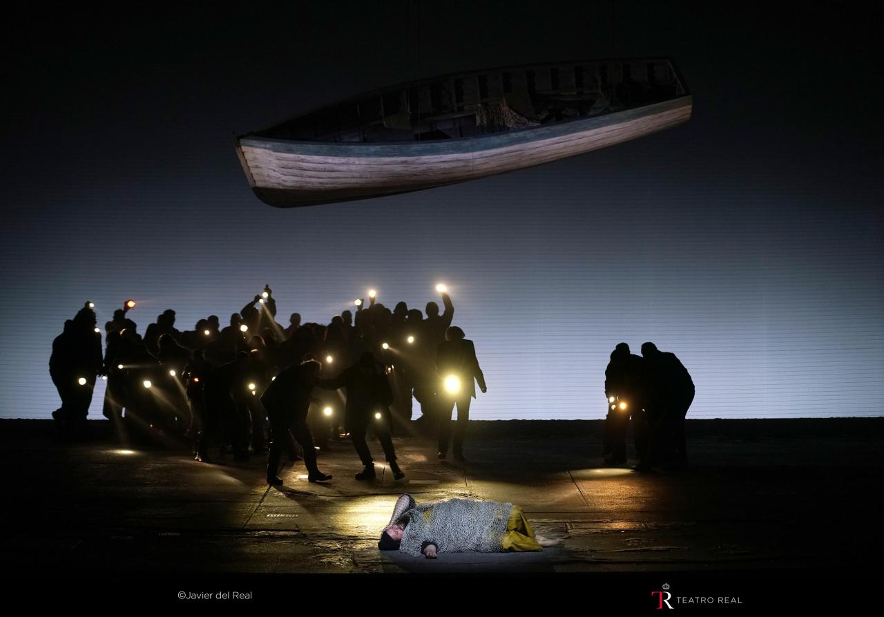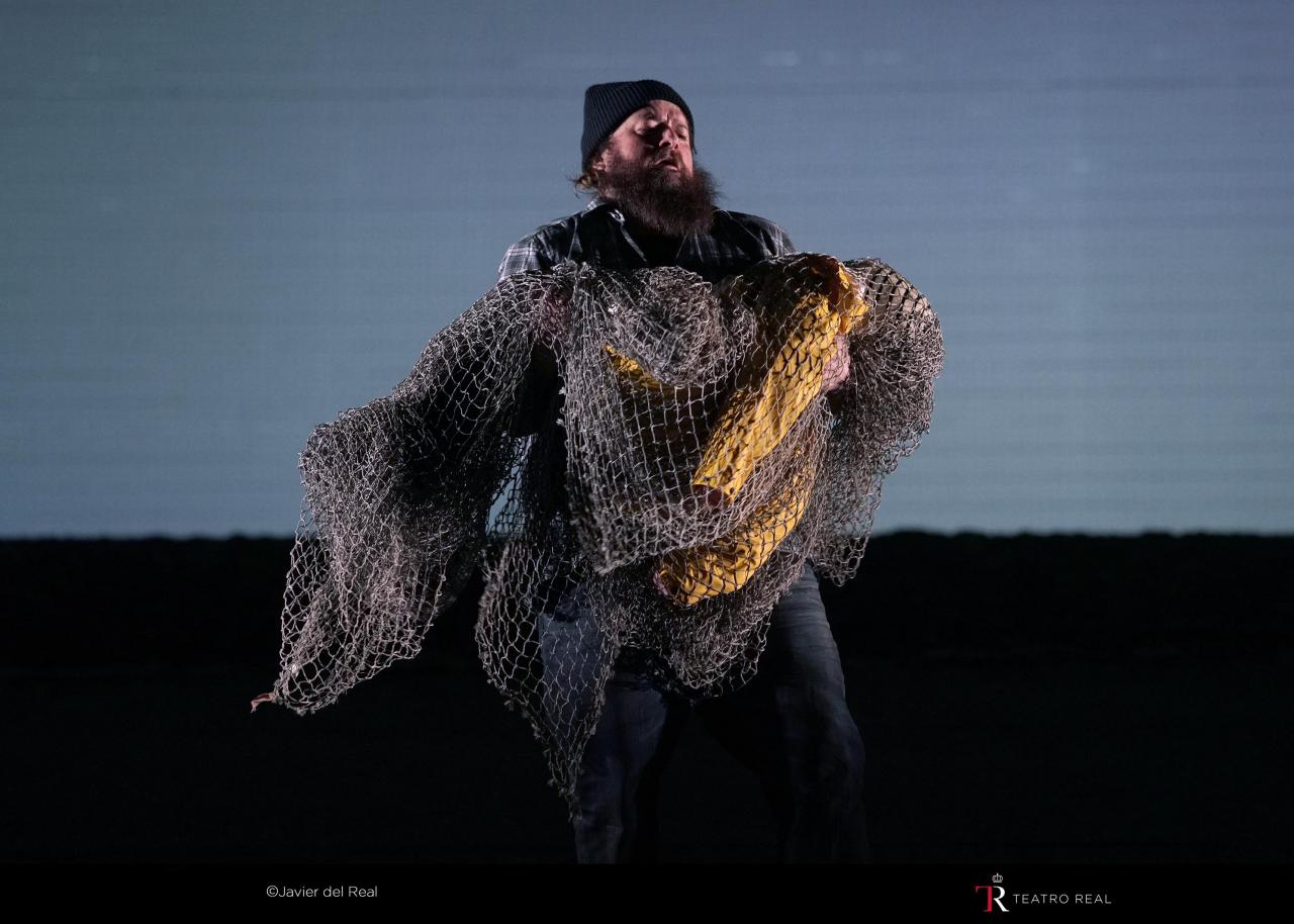 Por último, la escena es esencial en Peter Grimes. Concebida para albergar a un gran número de personas en el escenario, ha supuesto un verdadero reto para el Teatro Real, que hace días se vio obligado a postponer el estreno por la aparición de algunos positivos de covid entre el elenco y el coro. Se ha tenido que recurrir a medidas excepcionales (mascarillas para los miembros del coro -no para los solistas-, distancia de metro y medio entre los músicos e instalación de paneles de metacrilato, o reducción del aforo al 66%, en lugar del máximo autorizado del 75 %). No obstante, y pese a las limitaciones, hay que reconocer que, junto con el coro, la escena es el punto más fuerte de esta producción. El ambiente que recrea el canadiense Michael Levin es en apariencia sencillo: un pueblo pesquero vive pendiente del mar, cuyo estado (durante la obra es casi siempre el de un mar embravecido, que anega calles, derrumba el acantilado…) condiciona cada día y la vida entera de los habitantes. Por poner solo un ejemplo, en la escena segunda del Acto I, los vecinos acuden a refugiarse a la taberna del pueble, el Jabalí, que es testigo consuetudinario de sus vidas. Un detalle cómico introducido por el coreógrafo Kim Brandstrup, es hacer coincidir cada arrebato de viento enfurecido, expresado con Britten con toda la fuerza del viento metal, con la rotura de los postigos de la taberna, tras lo que más y más vecinos entran corriendo cada vez a refugiarse del temporal, hasta que al final de la escena prácticamente todo el elenco de artistas se encuentra sobre el escenario. También hay elementos oníricos: durante el Primer Preludio, coincidiendo con la música acuática antes mencionada, un bailarín aéreo es descolgado desde el techo del escenario simulando que está en el fondo del mar, a merced de los movimientos del agua (representa el remordimiento de Grimes por la muerte del muchacho). Se trata de una ingeniosa solución de Levin para dar movimiento escénico a una parte de la obra que es solo musical. La escena también tiene mucho de pictórico: el cuadro primero del Acto II recuerda, por la disposición de los elementos y lo plano del fondo del escenario (ocupado por el mar,de un bello amarillo claro, en una apacible mañana de domingo),algunas pinturas de Dalí. En momentos como este, la iluminación, a cargo de Peter Mumford, ofrece al espectador bellos cuadros de un color pastel apagado. En definitiva, hay que felicitar al equipo escénico, que ha sabido hacer un gran trabajo en esta producción con relativamente pocos elementos.