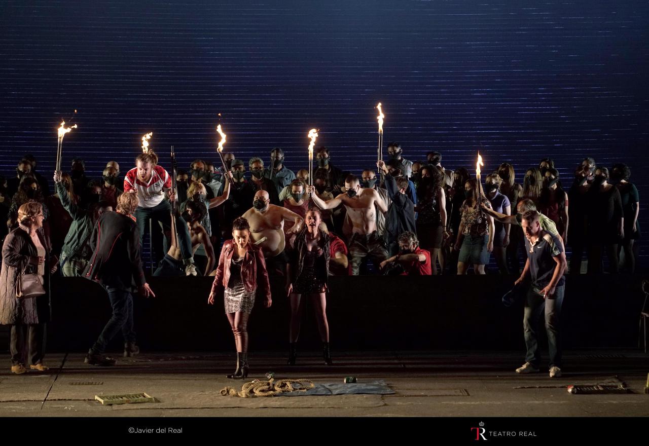 Como se apuntó arriba, la parte coral es el otro de los puntos fuertes de Peter Grimes. La partitura es complejísima, llena de imbricados concertantes con los que Britten recrea con gran realismo las discusiones y trifulcas propias de una taberna. Pero en otros casos, cuando el pueblo acusa y habla con una sola voz, son los momentos de más fuerza sonora de toda la obra. Es preciso alabar el trabajo de los cantantes (cantar con mascarilla es algo que desorienta mucho a un cantante, dado que sólo poder oírse a través del dentro de su cuerpo) y de su director, Andrés Maspero.